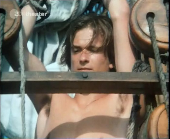 Segelkammer empfehlen die Gauner dem Kapitän, das verbrannte Segelzeug