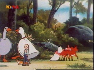 Smirre, der Fuchs, den Wildgänsen. Obwohl er hungrig ist, will er