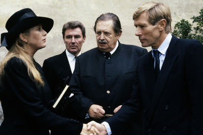 Bild ZDF: Wie soll es weitergehen nach dem Tode des Barons? Silva von Bernried (Jutta Speidel, li.), Restaurantpächter Brenken (Claus Tinney, 2.v.li.), Bürgermeister Walzinger (Georg Marischka, 2.v.re.) und Vellberg (Horst Janson, re.) wollen Silva helfen.