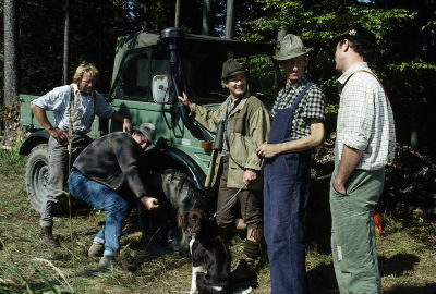 Bild ZDF: Förster Rombach (Christian Wolff, Mi.) und seine Waldarbeiter staunen über die Bärenkräfte ihres neuen Forstarbeiters. (V.li.n.re.: Hermann Giefer, Bernhard Helfrich, Christian Wolff, Volker Prechtel, Hans Stadlbauer).