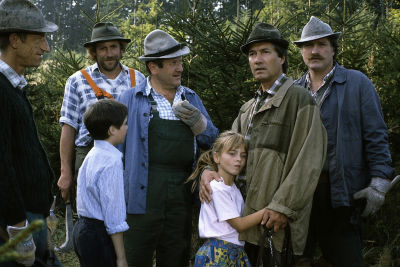 Bild ZDF: Rica (Nicole Schmid, 3.v.re.) hat in Peter (Nikolai Bury, vorne) einen neuen Freund gefunden. Sein Vater, Bauer Bellinghaus (Udo Thomer, 3.v.li.), hilft bei den Waldarbeitern und Rica überredet ihren Vater (Christian Wolff, 2.v.re.), dass Peter im Forsthaus übernachten darf. (Volker Prechtel, li.; Hermann Giefer, 2.v.li.; Bernhard Helfrich, re.).