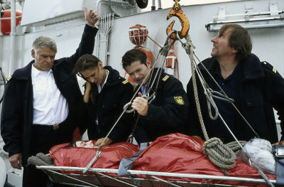 Bild ZDF: Die Mannschaft der Albatros II (v.l.n.r.: Rüdiger Joswig, Stefanie Schmid, Andreas Arnstedt, Elmar Gehlen) fischt zwischen verkohltem Treibgut ein etwa 15-jähriges Flüchtlingsmädchen (Philippa Galli, liegend) völlig unterkühlt aus der Ostsee.