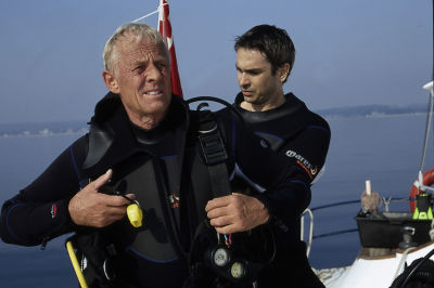 Bild ZDF: Thure Sander (Manou Lubowski, re.) hilft seinem Vater Jörn Sander (Rolf Becker, li.) beim Ausrüsten. Er plant, zusammen mit seiner kleinen Mannschaft zu einem Wrack aus Zeiten des Zweiten Weltkrieges zu tauchen. Noch ahnen die beiden nicht, dass Jörns Atemflasche manipuliert wurde und der Tauchgang ein jähes Ende nehmen wird.
