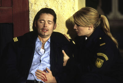 Bild ZDF: Bei einem Schusswechsel mit den "falschen" Inselpolizisten wird Kai Norge (Andreas Arnstedt, l.) lebensgefährlich verletzt. Bootsfrau Alex Johannson (Aline Hochscheid, r.) macht sich auf um Hilfe von der "Albatros II" zu holen.