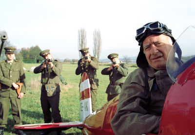 auf und klemmt sich hinter den Steuerknüppel seines Doppeldeckers.