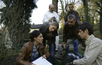 Bild ZDF: Die Soko inspiziert den Fundort der Leiche. (v.l.n.r. Jasmin Gerat, Kerstin Landsmann, Jophi Ries, im Hintergrund Mike Hoffmann). Der Pathologe Dr. Kraft (Thomas Clemens, r.) hat dazu einige interessante Informationen.