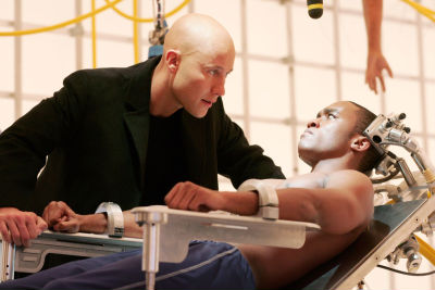 Bild RTL: Lex (Michael Rosenbaum, li.) und seine Handlanger bei LuthorCorp haben den Footballspieler Victor Stone (Lee Thompson Young), der bei einem Unfall umgekommen war, wiederbelebt und darüber hinaus mit technischen Bauteilen versehen, so dass Victor nun, halb Mensch halb Maschine, mit ähnlich übermenschlichen Kräften und Fähigkeiten ausgestattet ist wie Clark.
