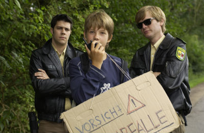 Bild ZDF: Tom (Björn Kirschniok, l.) und Henner (Kai Ivo Baulitz, r.) ertappen den "Blitzlichtwarner". Es ist ein kleiner Junge, der sein Taschengeld aufstocken will.