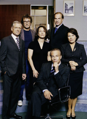 Bild ZDF: v.l.n.r.: Der Chef des Kanzleramts Norbert Kraft (Robert Atzorn), der Redenschreiber Alexander Nachtweih (Heikko Deutschmann), die Abteilungsleiterin Aussenpolitik Edith Lambert (Claudia Michelsen),der Regierungssprecher Conny Bergmann (Herbert Knaup), die Leiterin des Kanzlerbüros Birte Schmitz (Rita Russek), der Fahrer des Kanzlers Tim Altmann (Robert Glatzeder) und sitzend: der Bundeskanzler Andreas Weyer (Klaus J. Behrendt).