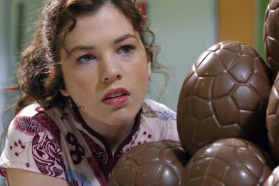 sich ihrer Schokoladensucht hingebend durch die Ausstellung knabbert. Die