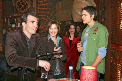 Bild SAT 1: Inka (Stefanie Höner, hinten) traut ihren Augen nicht: Ihr Sohn Timo (Matthias Dietrich, r.) trifft sich ohne ihr Wissen mit seinem Vater Thomas (Michael Schütz, l.) und dessen Freundin Britta (Susanne Berckhemer, 2.v.l.).