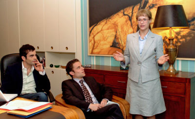 Bild SAT 1: Voller Spannung verfolgen David (Mathis Künzler, l.) und Max (Alexander Sternberg, M.) Lisas (Alexandra Neldel, r.) Präsentation für die Bank. Wird sie es schaffen, den Kredit zu bekommen?