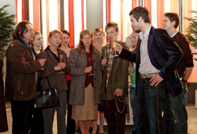 Bild SAt 1: David (Mathis Künzler, r.) ist über die Verlobung von Lisa (Alexandra Neldel, M.) und Jürgen (Oliver Bokern, 3.v.r.) so erleichtert, dass er spontan die Kollegen und Lisas Eltern Bernd (Volker Herold, l.) und Helga (Ulrike Mai, 3.v.l.) zu einem kleinen Fest einlädt.