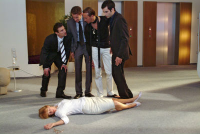 Bild SAT 1: Lisa (Alexandra Neldel, vorne) wird versehentlich von David (Mathis Künzler, r.) niedergeschlagen, als sie versucht, die Prügelei zwischen ihm und Richard (Karim Köster, l.) zu beenden. Geschockt betrachten David, Richard, Max (Alexander Sternberg, 2.v.l.) und Hugo (Hubertus Regout, 2.v.r.) die am Boden liegende Lisa.