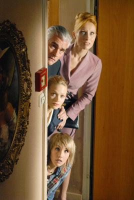 Bild RTL: (v.unten) Sarah Gabriel (Maxi Warwel), Lilo Gabriel (Mavie Hörbiger), Paul Gabriel (Sky du Mont) und Adina Gabriel (Andrea Sawatzki) schauen in ihrem neuen Gasthaus zwielichtigen Gästen hinterher.