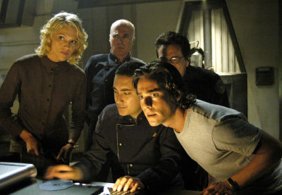 Bild RTL II: Shelly Godfrey (Tricia Helfer, li.) bringt Com. Adama ein Video, welches angeblich beweist, dass Dr. Gaius Baltar für den Holocaust verantwortlich ist. (Foto v.li.: Tricia Helfer, Michael Hogan, Alessandro Juliani, James Callis und Edward James Olmos).