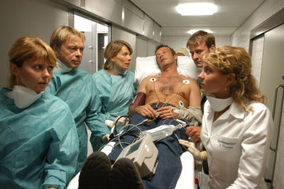 Bild ZDF: Der verletzte Markus wird vom Klinik-Team empfangen. (Darsteller, v.l.n.r. : Renate - Roswitha Schreiner, Baumann - Volker Lechtenbrink, Katharina - Ursula Karven, Markus - Michael Roll, Jan - Marcus Mittermeier, Anna - Luise Bähr)