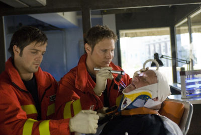 Bild ZDF: Haase (Fabian Harloff, mi.) und Sanitäter Malte (André Willmund) übernimmt die Erstversorgung des verletzten Pförtners (Detlef Bierstedt, re.).
