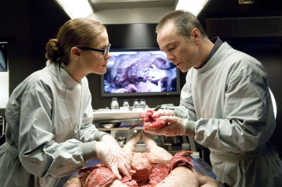 Bild RTL: Bon Appetit! Die Doctores Bergmann (Anne Cathrin Buhtz) und Koch (Hannes Jaenicke) weiden einen Leichnam aus und bezweifeln, dass Karin Böhme wirklich an Herzversagen gestorben ist.