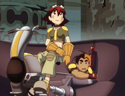 und Koji mit den Ersatzteilen, die sie von den Außerirdischen bekommen