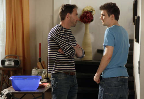 Melanie glaubt, dass Lilli ihr kündigen will. Als Melanie sich weiter weigert, sich von Sebastian zu trennen, sieht Lilli sich gezwungen, sie zu beurlauben. Melanie ist enttäuscht von ihren Freundinnen und erzählt Sebastian, dass sie überlegt, den Job bei Wetzmann aufzugeben. Alarmiert trennt sich Sebastian aus scheinbar selbstlosen Gründen von ihr. - Als Paul Bärbel von seiner nicht bestandenen Prüfung erzählen will, bringt er es angesichts ihrer Vorfreude über sein bestandenes Abi nicht übers Herz und lügt sie an. Doch Gaston kann er nichts vormachen und dieser setzt ihn unter Druck, die Nachprüfung wenigstens zu versuchen. Mit Hilfe von Theo und Rosa fängt er an, wie ein Verrückter zu lernen. Doch als er von Rosas Verliebtheit zu K.E.N. erfährt, wirft ihn das ganz aus dem Konzept. In einem unbedachten Moment gesteht er Theo die Liebe zu Rosa. ![]() Gaston (Nicolas König, l.) setzt seinen Sohn Paul (Joel Stuehl, r.) unter Druck. Er soll die Abi- Nachprüfung wenigstens versuchen. |