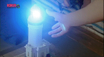 strahlt der Modell-Leuchtturm ein helles Licht aus und eine schwebende